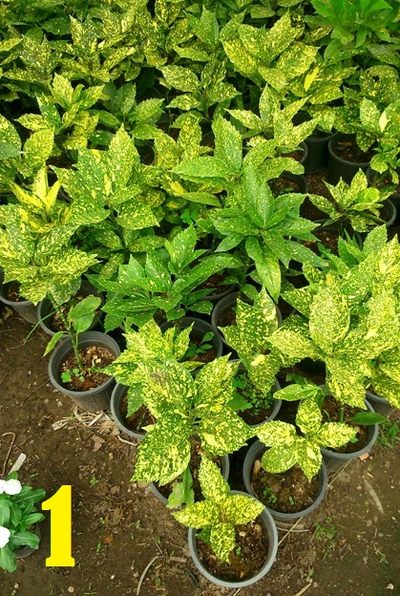 یک گونه از آن که موسوم به کروتنیفولیا AUCUBA japonica 'Crotonifolia' است که برگهای زیبا با رنگ های ابلق زیبا و در هم را دارا میباشد و در گلدان کاشته شده و برای تزیین تراس ها و بالکنها و باغچه های نیمه آفتابگیر و یا سایه به کار میرود.